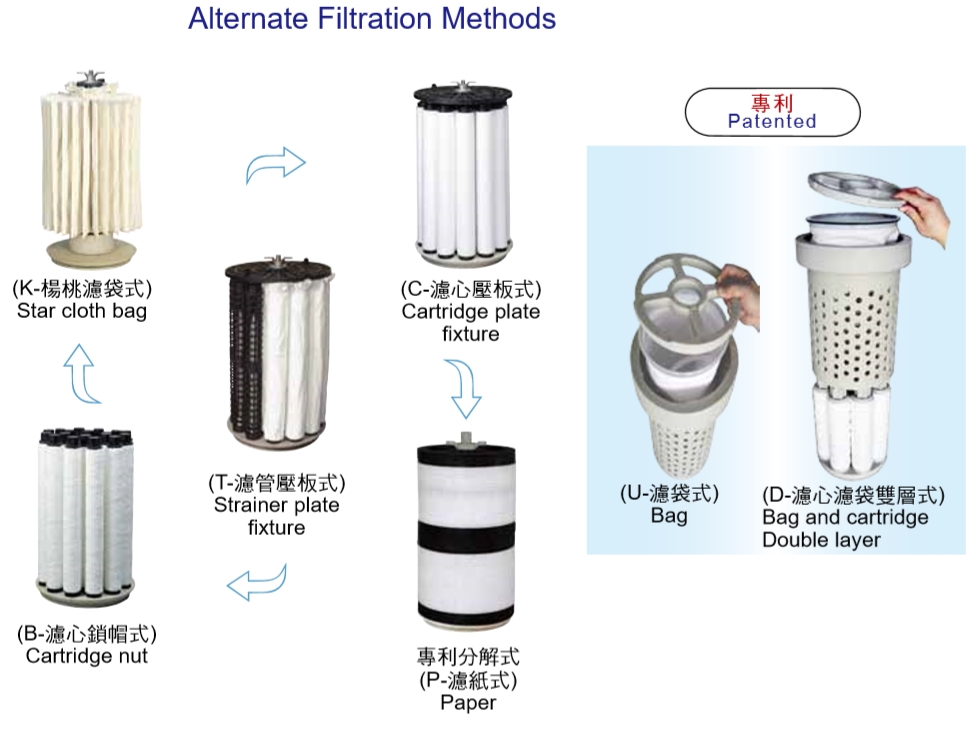 ● Both filtration methods of cartridge plate fixture and cartridge nut are available for second chamber.